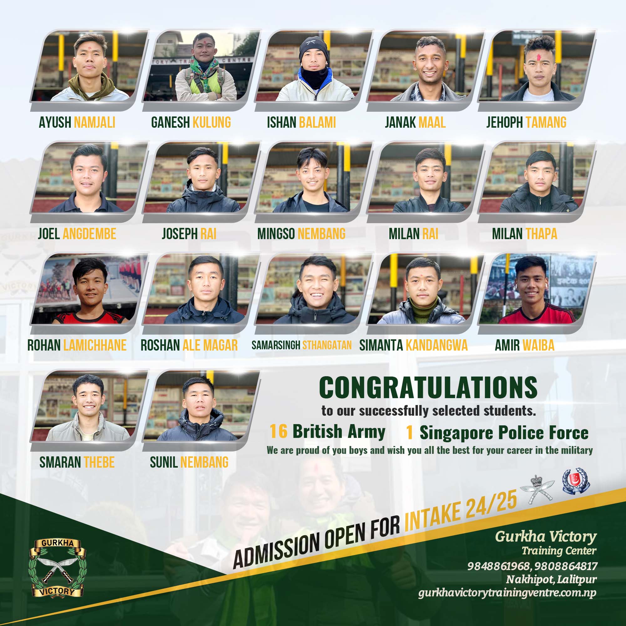 16 Selected in British Army and 1 selected in Singapore Police Force